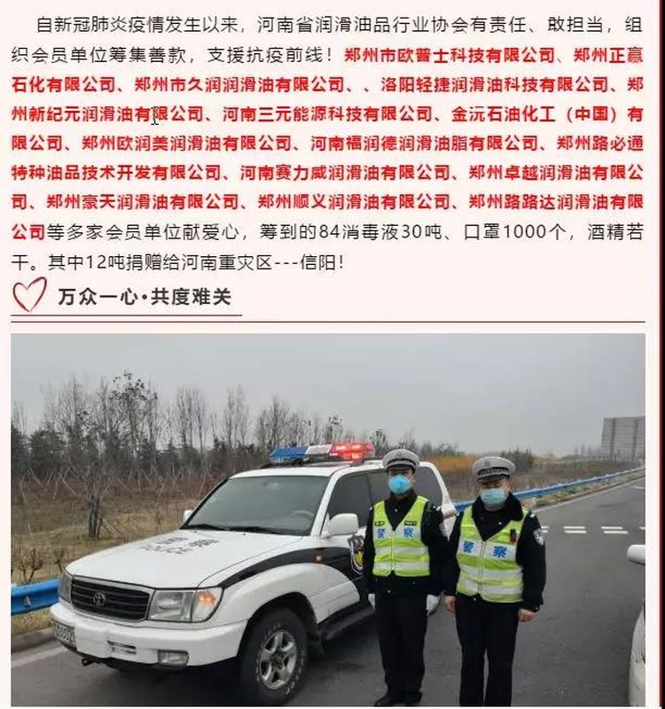 新冠肺炎疫情發生以來,河南三元科技能源有限公司在河南省潤滑油品行業協會的組織下,還積極參與了行業協會開展的系列疫情抗擊服務工作,彰顯了企業的社會責任與擔當!